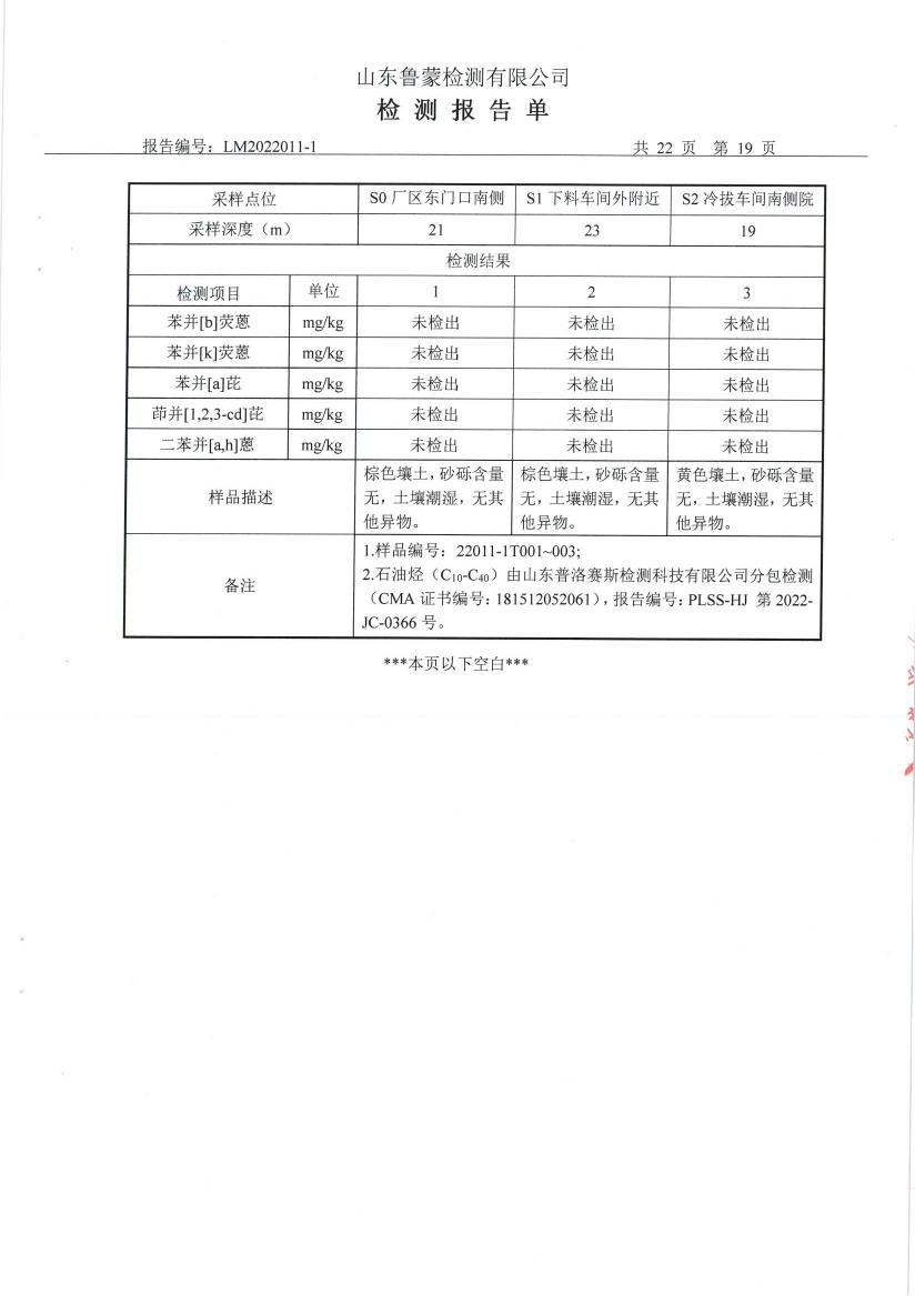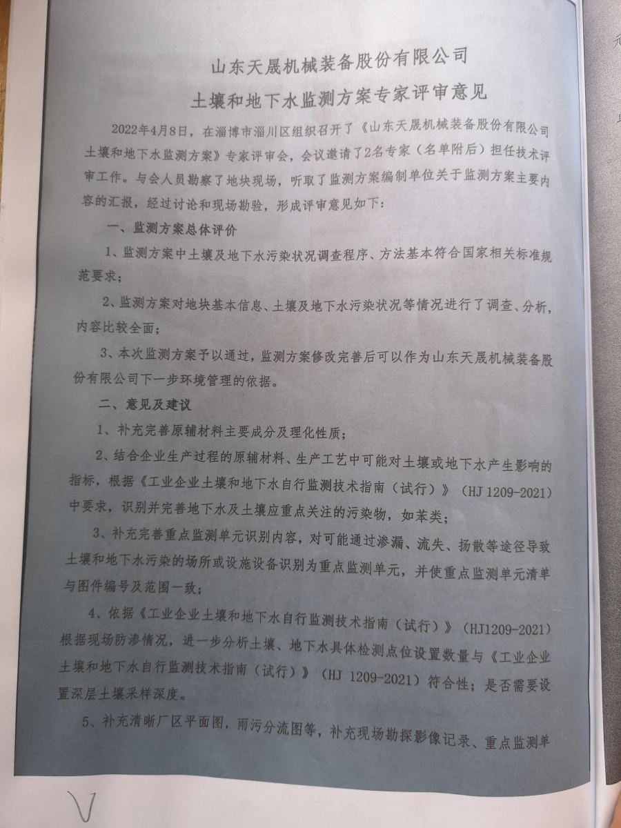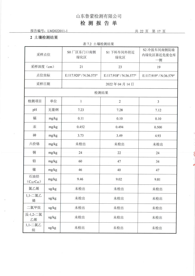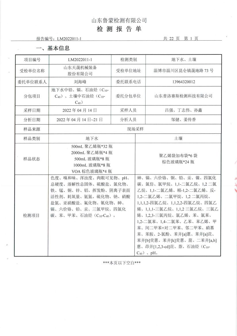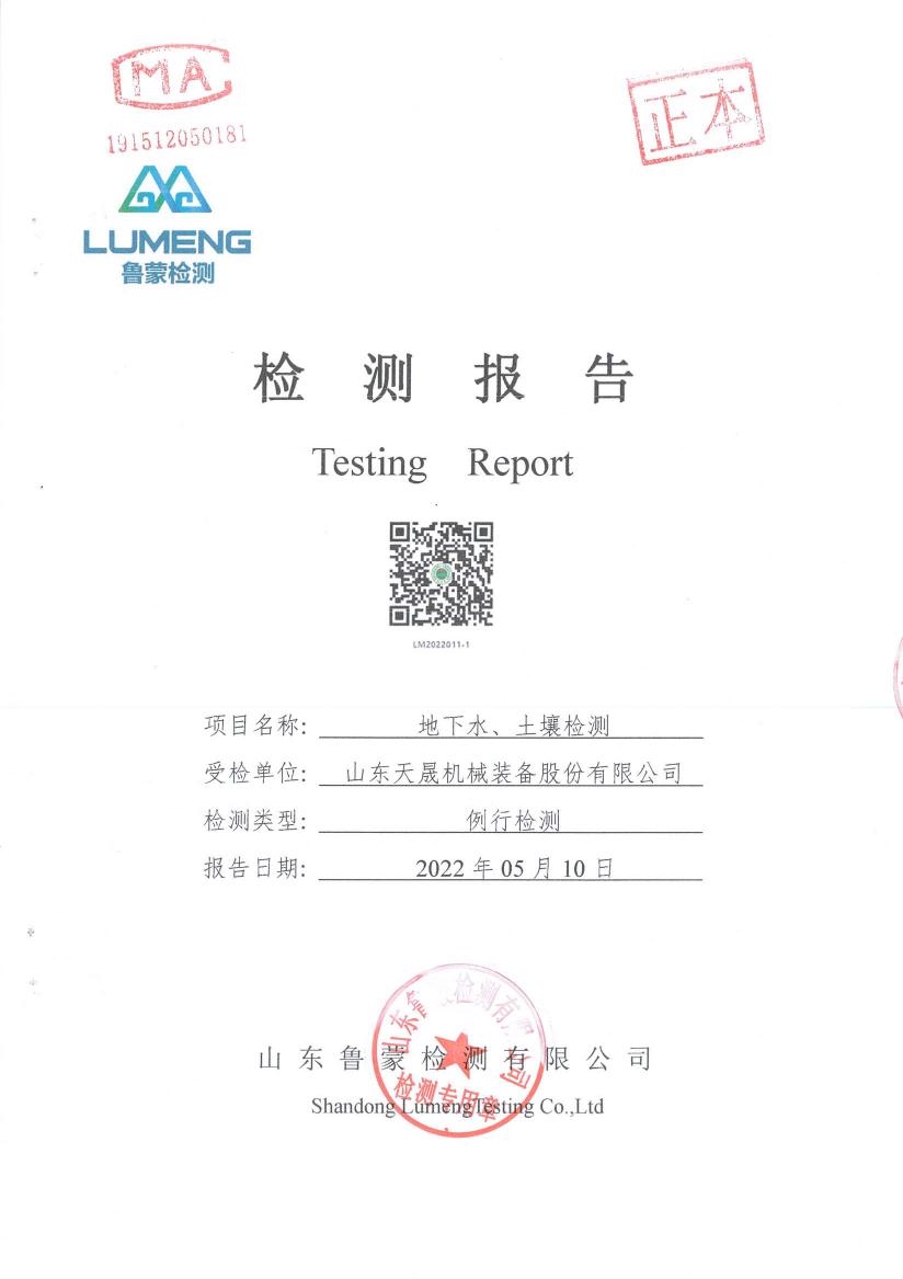 山东天晟机械装备股份有限公司2022年度委托山东鲁蒙检测有限公司对土壤和地下水进行了例行检测,检测报告公示如下,以便公众监督。